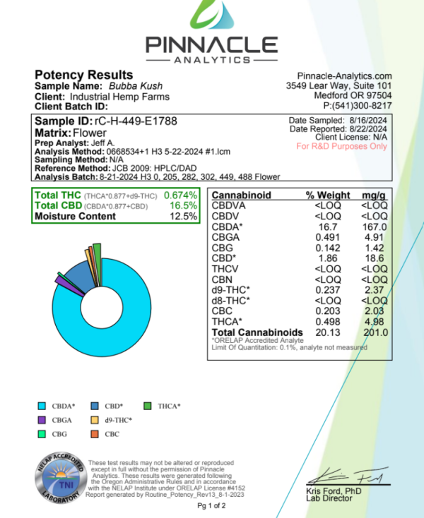 CBD Bubba Kush is bred to retain the dense structure and rich terpene profile of its THC counterpart, but with compliant cannabinoid content. Industrial Hemp Farms ensures that this strain is cultivated under strict standards. Grown without pesticides and under carefully monitored conditions, the plants develop a consistent cannabinoid profile while staying below the federally mandated 0.3% Delta-9 THC threshold as defined by the 2018 Farm Bill.