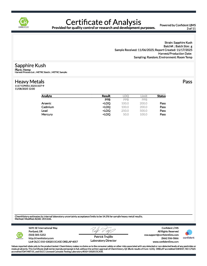 Saphire Kush is a sun-grown, indica-leaning hybrid hemp flower cultivated in Southern Oregon. Open-air fields and long daylight hours help the plant develop its natural structure, aroma, and cannabinoid profile. Known for dense buds and classic Kush character, Saphire Kush has a smooth, grounded profile that fits well into slower evenings, quiet weekends, and end-of-day routines.