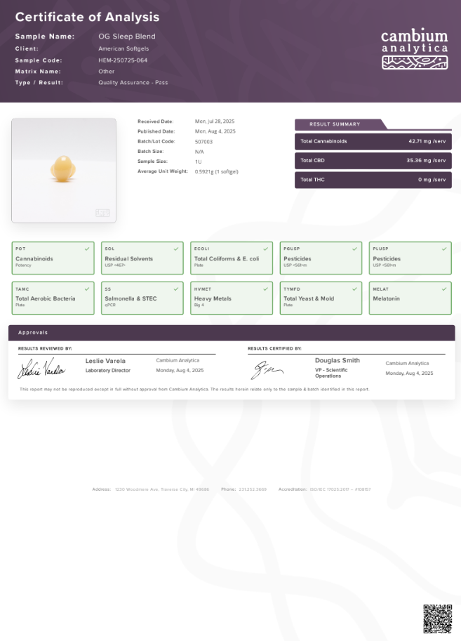 Soft gel infused with 25mg CBD Broad Spectrum, 3mg CBN,  3mg Melatonin, and  cut with MCT oil